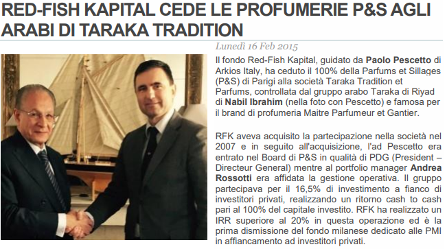 Il fondo Red-Fish Kapital ha ceduto 100 % della società Parfums & Sillages alla società Taraka Tradition et Parfums ;...